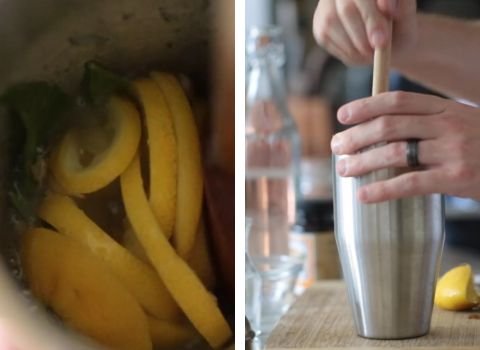 - Thinly slice 1 lemon and place slices in a shaker or pitcher. Add lemon verbena leaves. Squeeze juice from the second lemon (about 2–3 tablespoons) into the container.