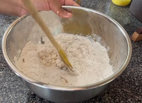 While the broth heats up, make your dough. Add the self-rising flour to a mixing bowl. Slowly pour in the ice water, a little at a time, stirring with a fork until the flour is wet and forms a shaggy dough.