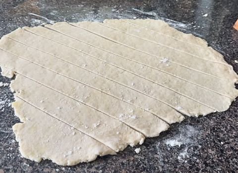 Once rolled, use a knife or pizza cutter to slice the dough into small strips or squares.