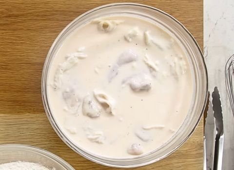 - Pour buttermilk over the chicken until each piece is coated. Let it rest for about 15–20 minutes. This helps tenderize the chicken and adds flavor.