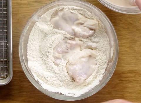 - Take one piece of chicken from the buttermilk and let the extra drip off. Roll it in the flour until fully covered. Gently shake off any excess flour. Repeat for all pieces. Make sure every piece looks dry and well coated before frying.