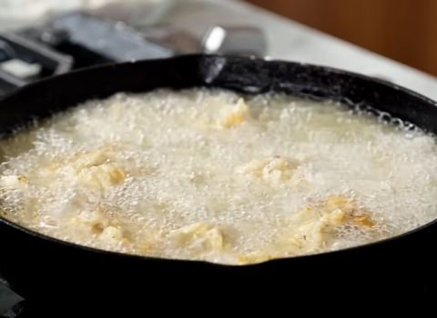 - Carefully place a few pieces in the skillet. Don’t crowd the pan; fry in batches. Let them cook for 8–10 minutes on one side until golden brown. Turn them gently with tongs or forks and cook the other side for another 8–10 minutes.