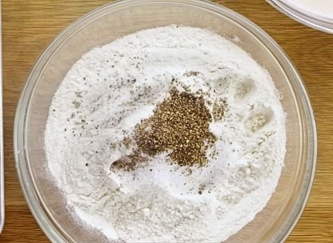 - In a separate bowl, pour about two cups of self-rising or all-purpose flour. Add a pinch of salt and black pepper. Stir until mixed evenly.