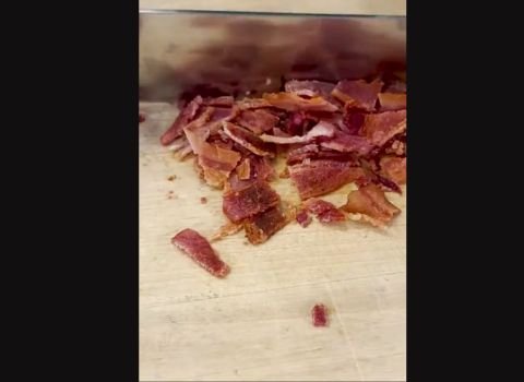 - Chop the thick-sliced bacon into small pieces and fry until crisp. Drain the bacon on a paper towel to remove extra oil. Keep it aside for later.
