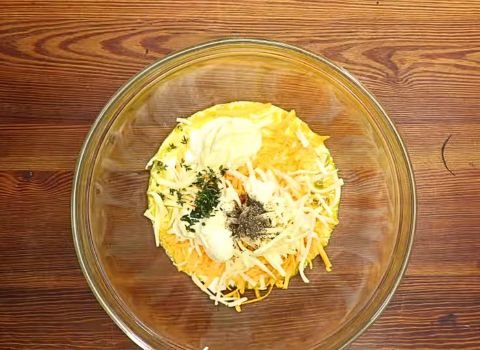- Add the entire bag of shredded cheese to the mayonnaise mixture. Next, add the sautéed onions and peppers. Then, gently fold in the well-drained squash. Sprinkle a little black pepper on top. Stir everything carefully so that the mayonnaise mixture coats all the squash and cheese evenly.