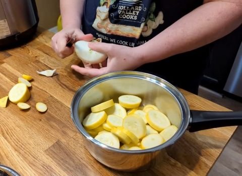 First, wash the squash. Cut the ends off each one. Then, slice them into round pieces about 1/4-inch thick. They do not have to look perfect. Place all the sliced squash into a large pot. Pour in enough water to cover the squash, and add a small sprinkle of salt.