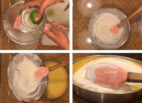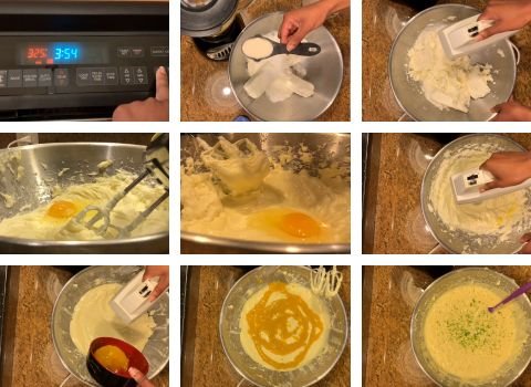 - Lower the oven temperature to 325°F (163°C). Beat the cream cheese and sugar until smooth and creamy with no lumps. Add eggs one by one, mixing after each. Add egg yolks and mix again. Then pour in the mango puree, lime juice, and zest. Stir until everything looks silky and even.