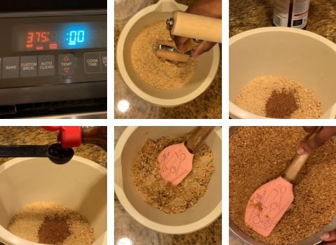 Preheat the oven to 375°F (190°C). Crush the graham crackers until they look like fine sand. Mix with sugar, nutmeg, and vanilla extract. Pour in the melted butter and stir until all crumbs are coated and stick together.
