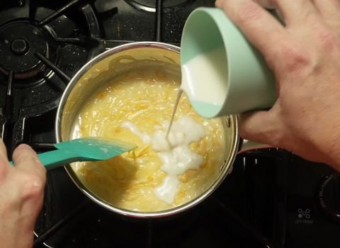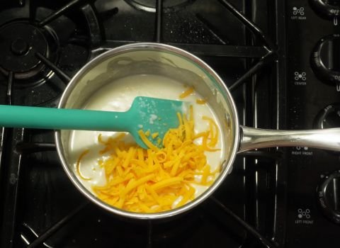 - Sprinkle the cheese into the warm base. Stir with a spoon as it melts. Add more cheese in small handfuls so it melts evenly. When the sauce gets too thick, pour in a little more milk and stir again.