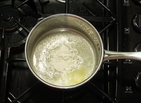 Once the butter is fully melted, sprinkle the flour over it. Use a whisk to blend the two together. This forms a paste. Keep whisking for one to two minutes so the mix stays smooth and does not burn. The paste should stay pale and thick.