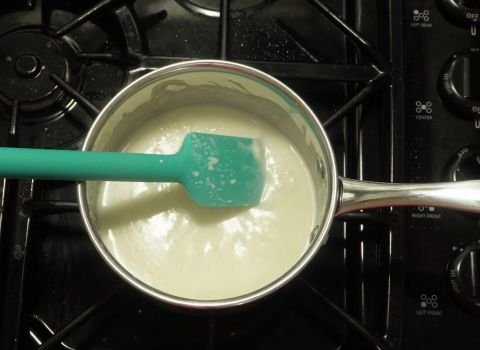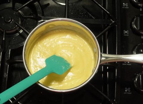 - Keep heating the base as you whisk. It will begin to thicken as it warms. Make sure the mix does not bubble too hard. A calm, steady heat works best for even cooking.