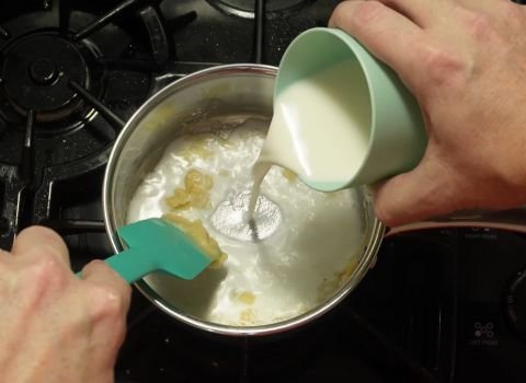 - Slowly pour in a small amount of milk. Whisk the pot so the paste blends with the milk. Keep adding milk a little at a time so the base stays smooth. The mix will start to thin out and turn creamy.