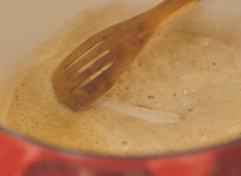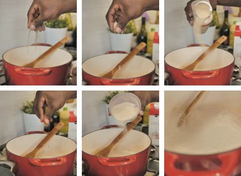 - Place a Dutch oven or deep pan on medium heat. Drop in a spoon of butter and let it melt. When the butter turns glossy and smooth, sprinkle in flour. Stir right away so the mixture blends into a soft paste. Let it warm until the color turns pale and light.