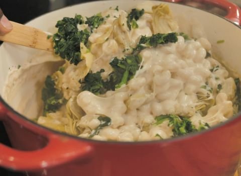 - Place thawed, drained spinach into the bowl. Add the drained, quartered artichokes. Stir again so the veggies spread evenly through the pasta and sauce.