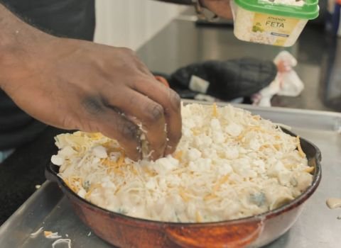 - Sprinkle the rest of the cheddar, mozzarella, and Parmesan blend over the top. Add small bits of feta around the surface. These toppings melt into a golden layer in the oven.