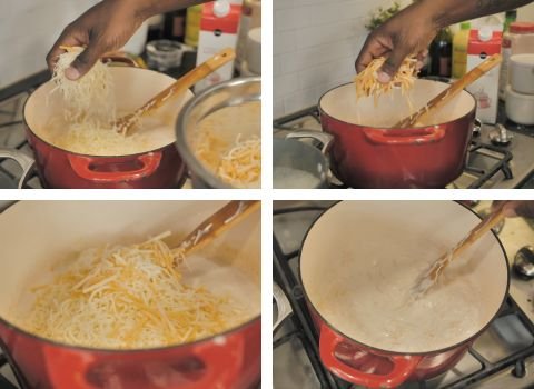 Also, make sure to melt your cheeses over low heat and stir constantly. Adding the cheese off the direct heat helps it melt smoothly without separating or becoming grainy.