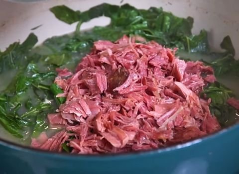 - Return shredded turkey meat to the pot and mix gently with greens.