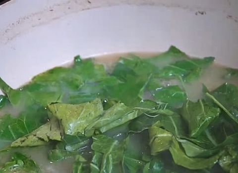 While the broth cooks, clean collard greens very well. Rinse several times in cold water until no dirt remains. Remove thick stems and slice leaves into thin strips.