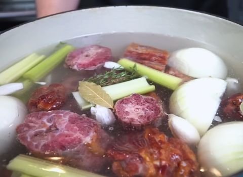 - In a large stockpot, add chicken broth, chicken base, smoked turkey legs, and turkey necks. Stir in onions, celery, garlic, bay leaves, and thyme. Bring to a boil, then lower heat and simmer for 60–90 minutes, until turkey meat is tender and falling off the bone.