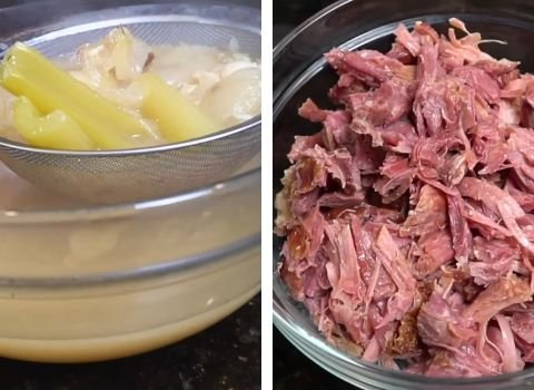 - Remove turkey from the pot and place in a bowl. Strain broth to discard cooked vegetables and herbs. Shred turkey meat, discarding bones and skin.