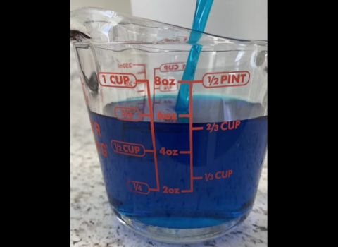 Pour 7 to 8 ounces of Hawaiian Shaved Ice blue raspberry shaved ice syrup into a large measuring jug. Add 32 ounces of cold water. Stir very well until the syrup fully blends with the water. The mixture should have an even, bright blue color.
