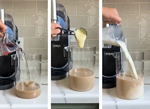 Add 1.5 cups of water, 1.5 cups of milk, and another 1.5 cups for extra creaminess. Then, pour in ¼ cup of sweetened condensed milk to make it rich and smooth.