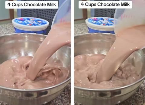 - Take your mixing bowl and pour 4 cups of chocolate milk into it. Use a measuring cup to get the exact amount.