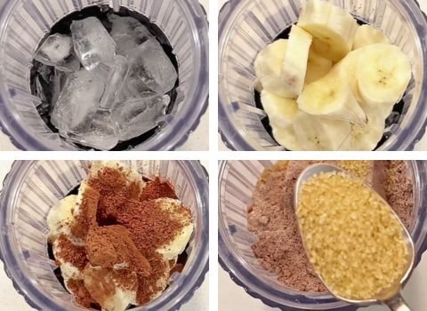 - Add ice, cacao powder, sliced banana, chocolate whey protein powder, turbinado sugar, butter pecan ice cream, and soy milk to the blender.